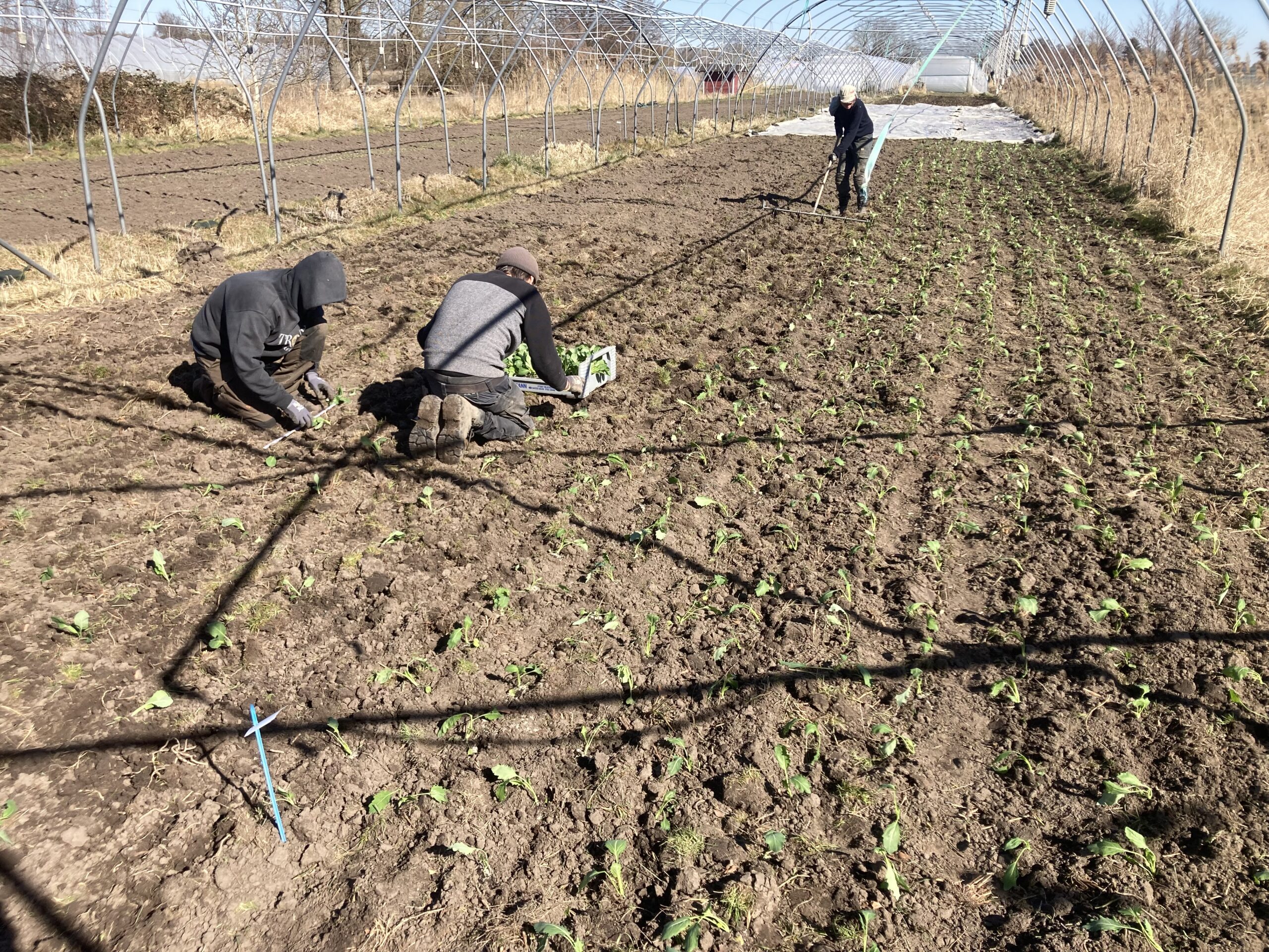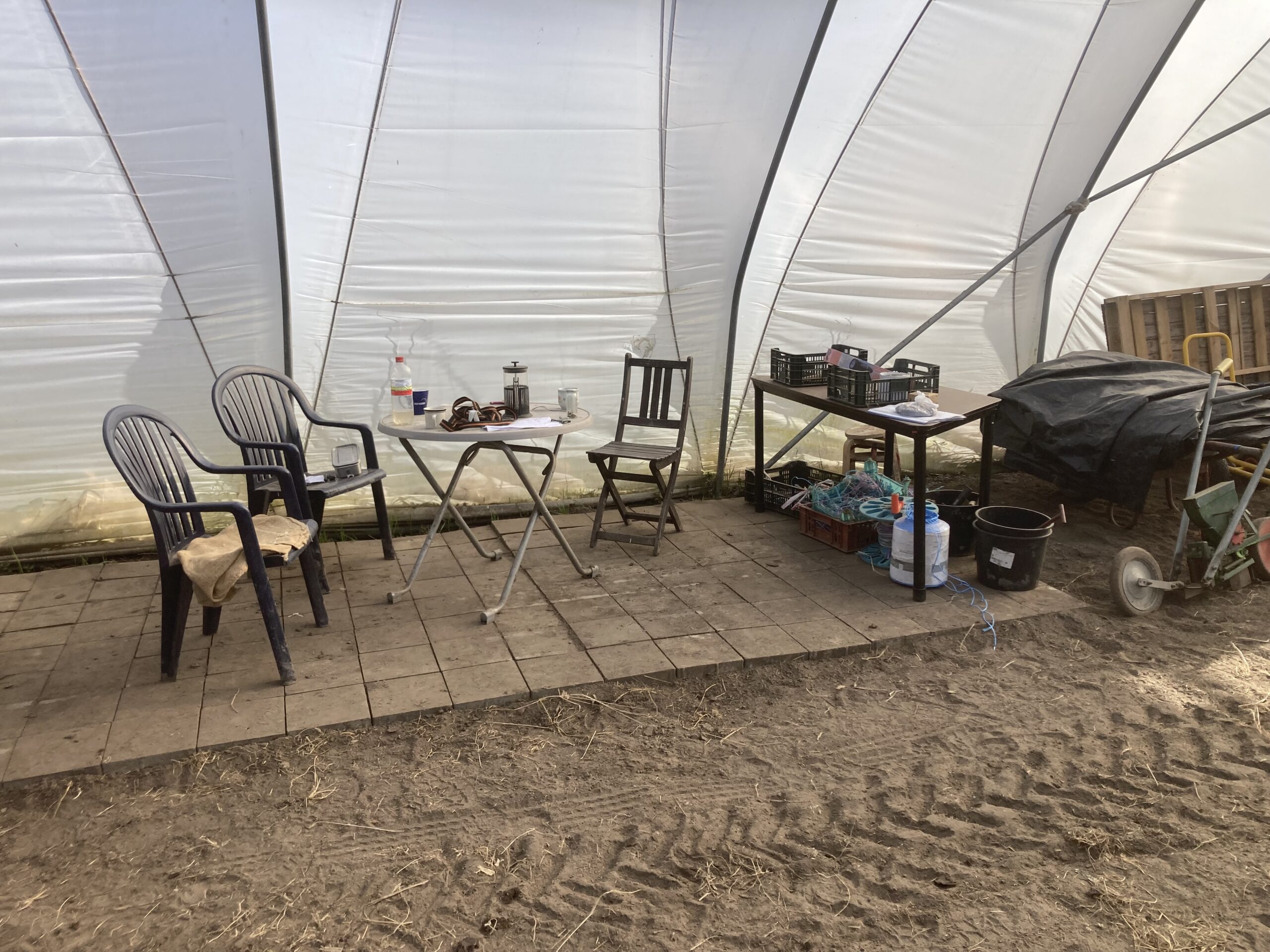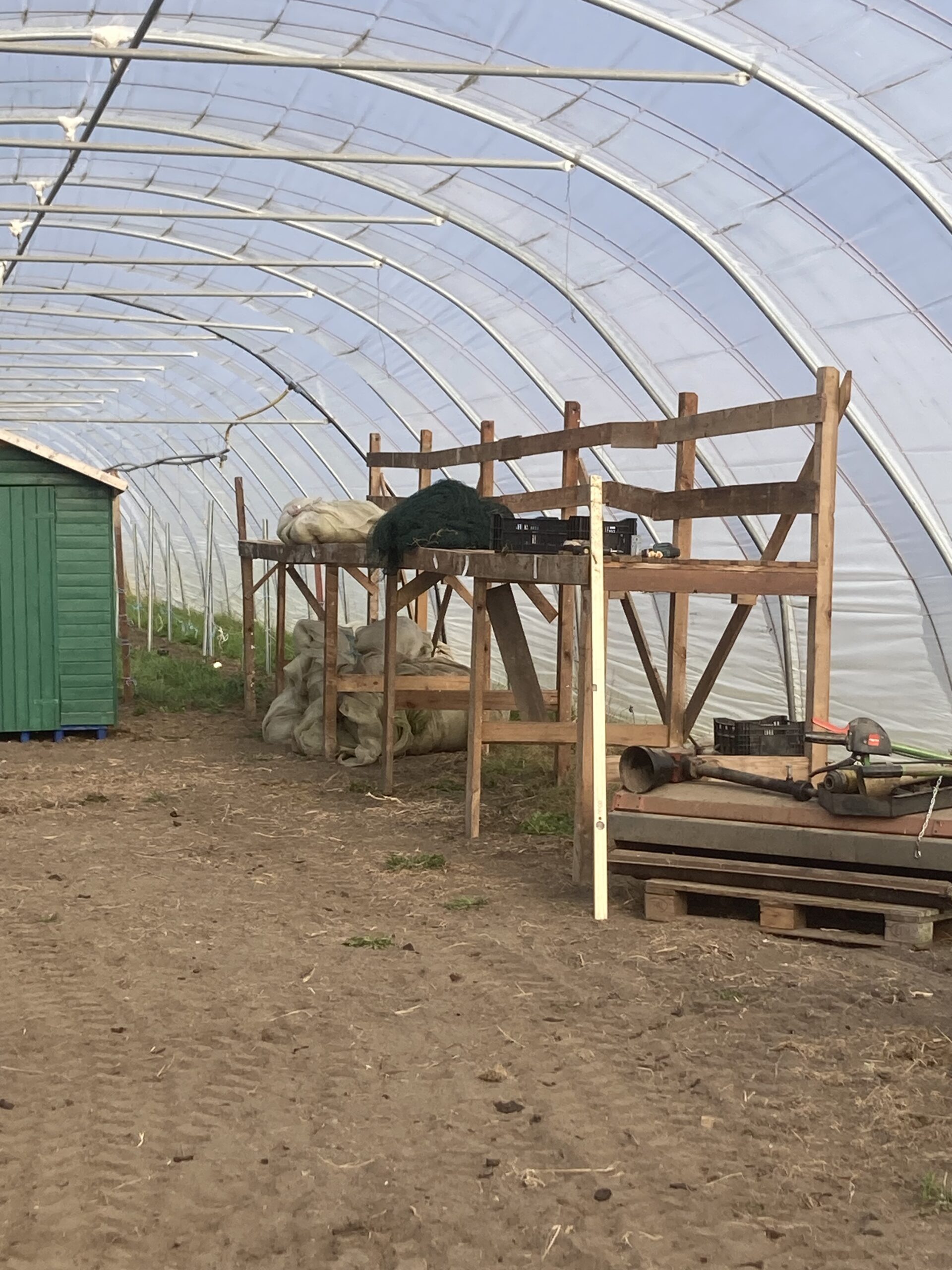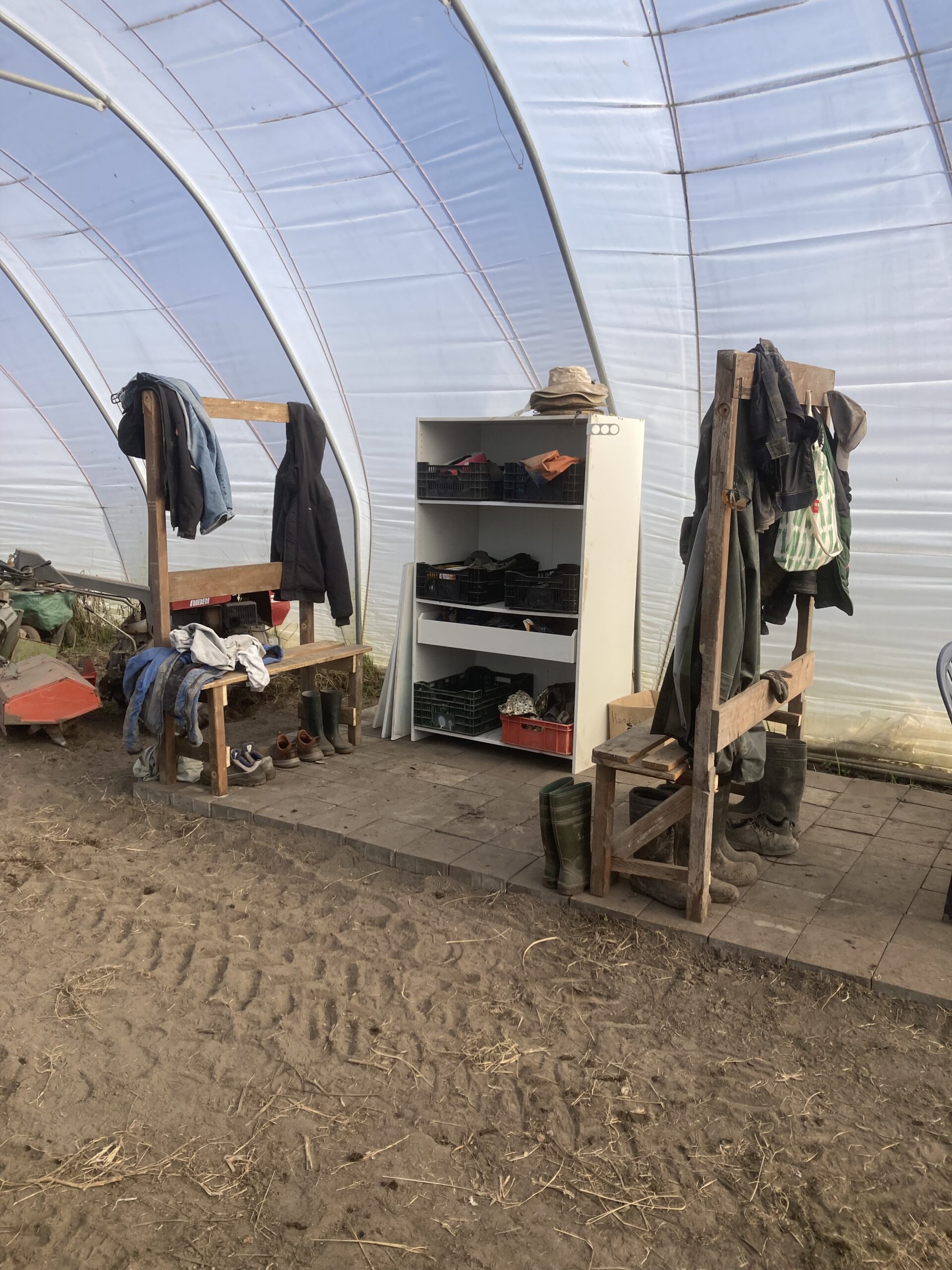Auch wenn ich für einen Teil der Woche ausfalle: Wir sind wieder zu viert! Mit Finn sind wir nicht mehr in Unterbesetzung und können die Aufgaben mit mehr Schlagkraft angehen. Und es tut sich einiges – auch abseits der startenden Saison. Einer unserer Tunnel wird langsam, aber sicher zu unserer „Hofstelle“ umgebaut – mit Garderobe, Lagerraum, Büro, Pausenraum und Waschplatz. Ach ja, und einem Treckerparkplatz! Ein echter Allround-Raum. 🙂 Jetzt sogar mit Leitungswasser und Strom – yeah!
