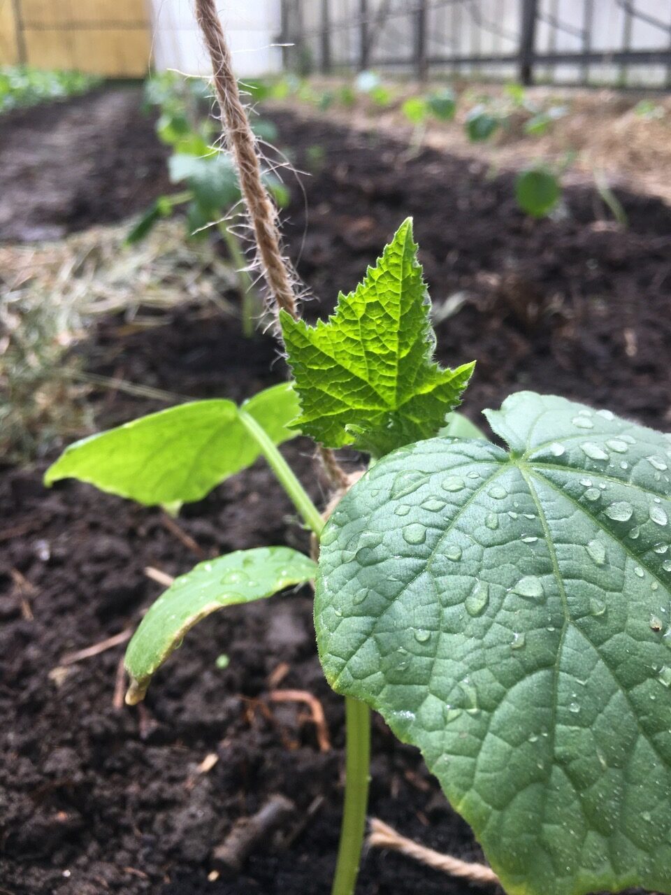 ersten Gurken sind festgebunden und haben zum Teil auch schon ein Mulchbett bekommen (Mulch