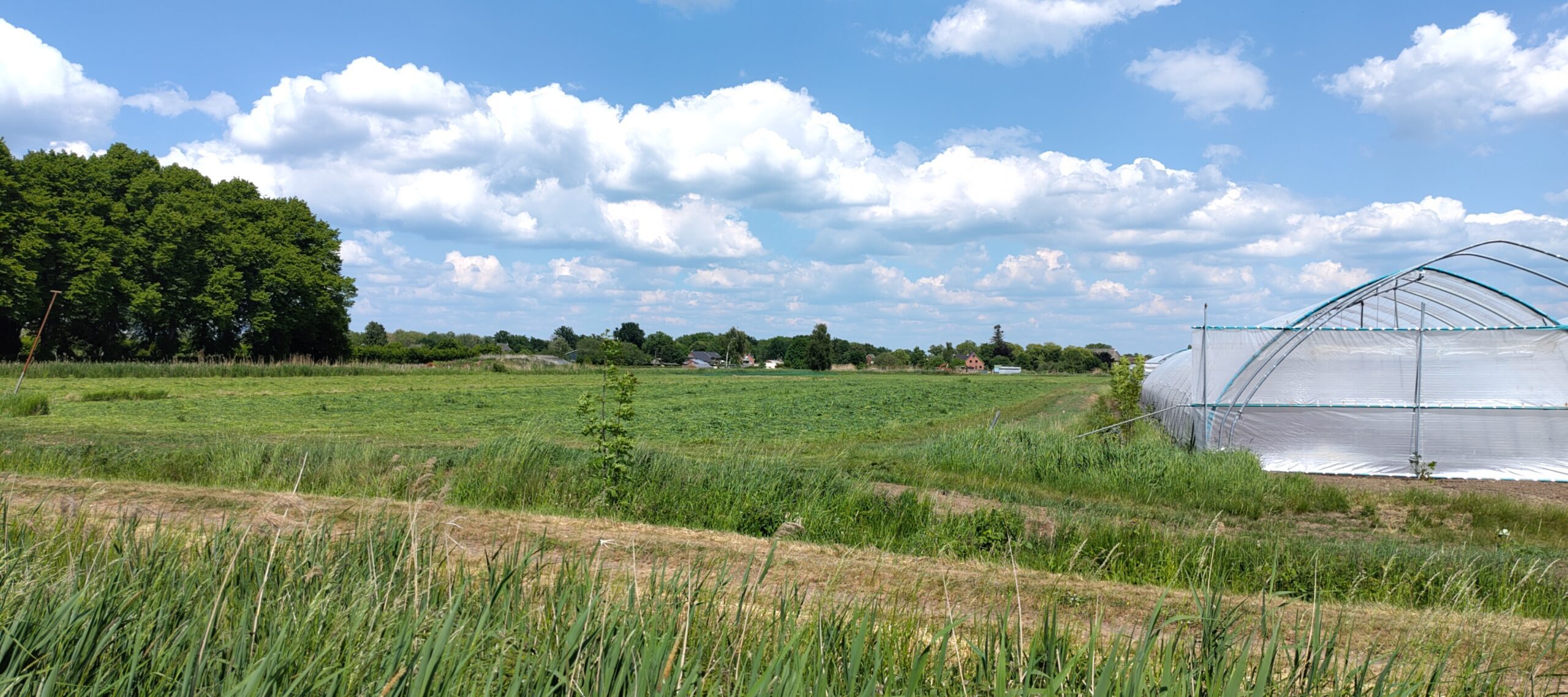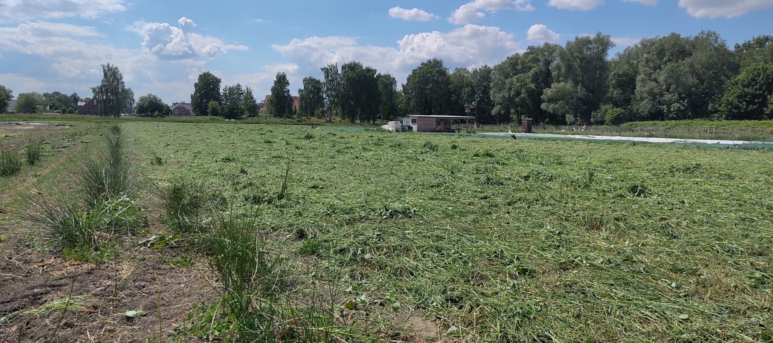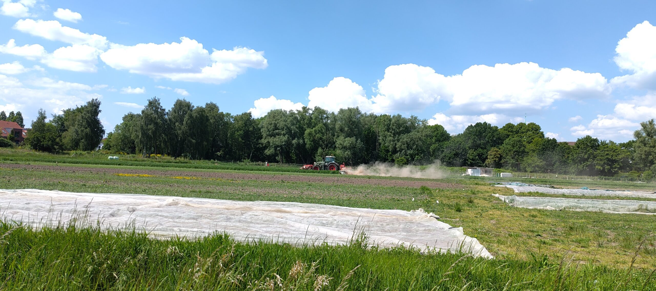 diese Woche war bei uns deutlich mehr Landwirtschaft als Gärtnern angesagt: Unser Klee-Gras, das uns als Gründüngung dient, wurde in den letzten Tagen von einem Lohnunternehmer gemäht. Das gemähte Gras nutzen wir die Saison über als Mulchmaterial für verschiedene Kulturen. Die eingesetzten Maschinen waren jedenfalls eine (oder zwei) Nummern größer als unsere; ein sehr ungewohnter Anblick auf unseren doch klein strukturierten Gemüseflächen. Auch die Arbeitsgeschwindigkeit und -breite waren sehr beeindruckend. Vor allem fand ich es interessant, dass dem Traktor mit Mähwerk eine Gruppe Greifvögel folgte, die direkt nach dem Mähen die frisch gemähten Flächen nach Essbarem absuchte. Ein bisschen später kamen dann noch Störche hinterher und wurden ebenfalls fündig. Die nächsten Arbeitsschritte in den kommenden Tagen sind das Schwaden (aus dem losen Gras Bahnen formen) und das Pressen und Wickeln zu Silageballen.