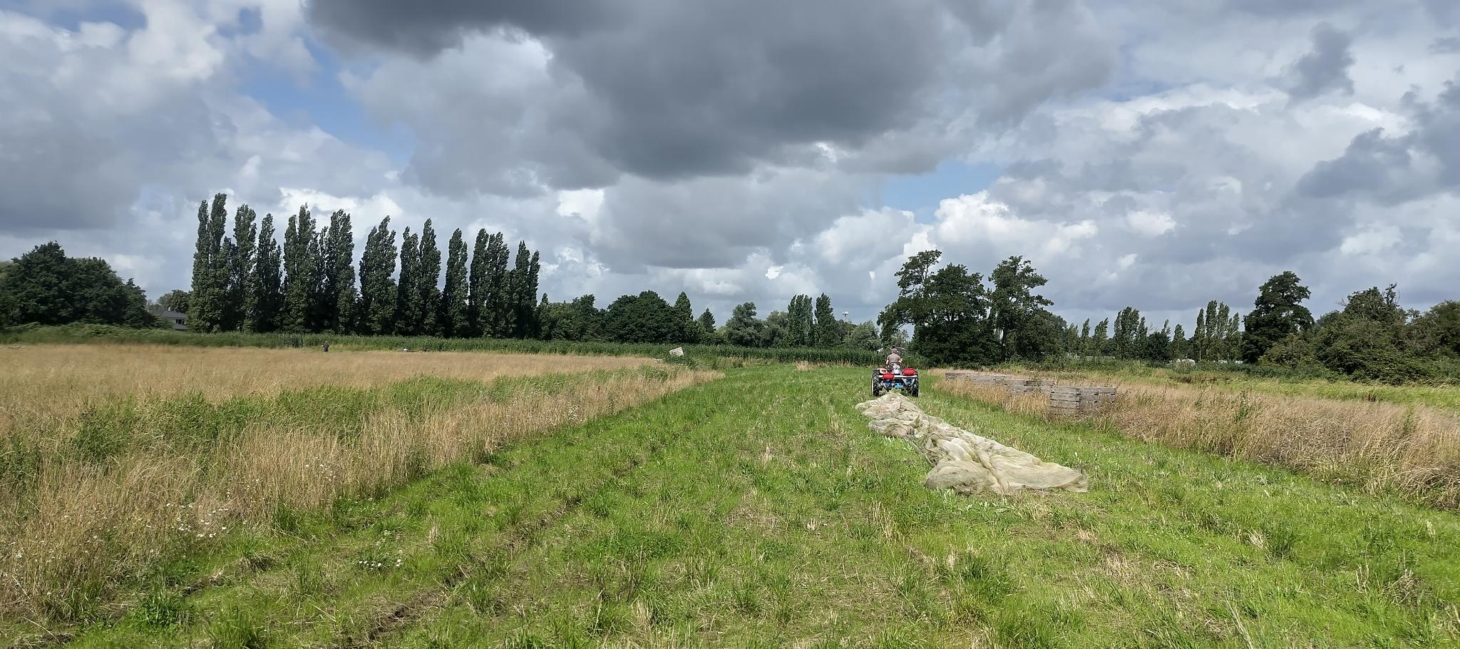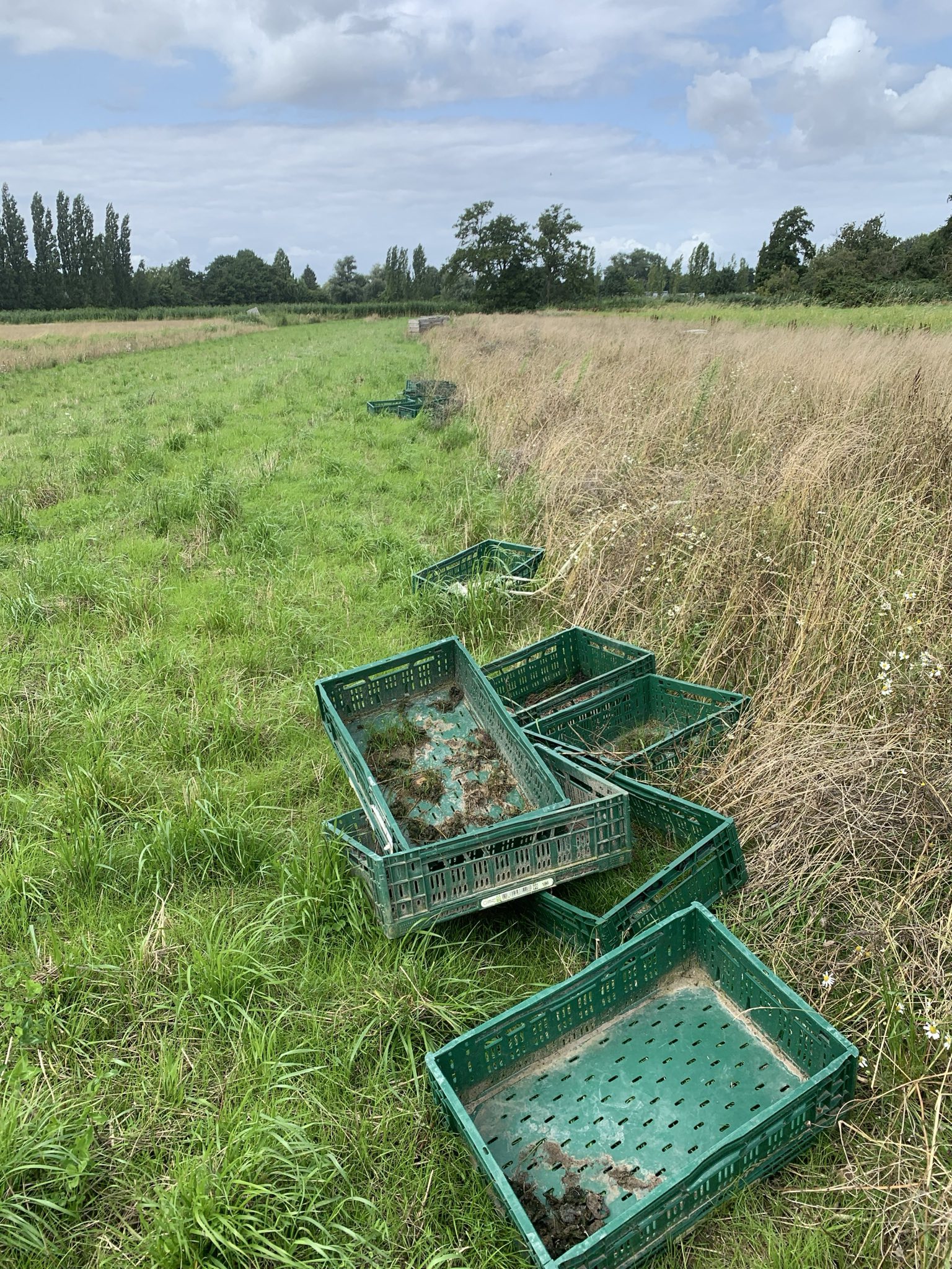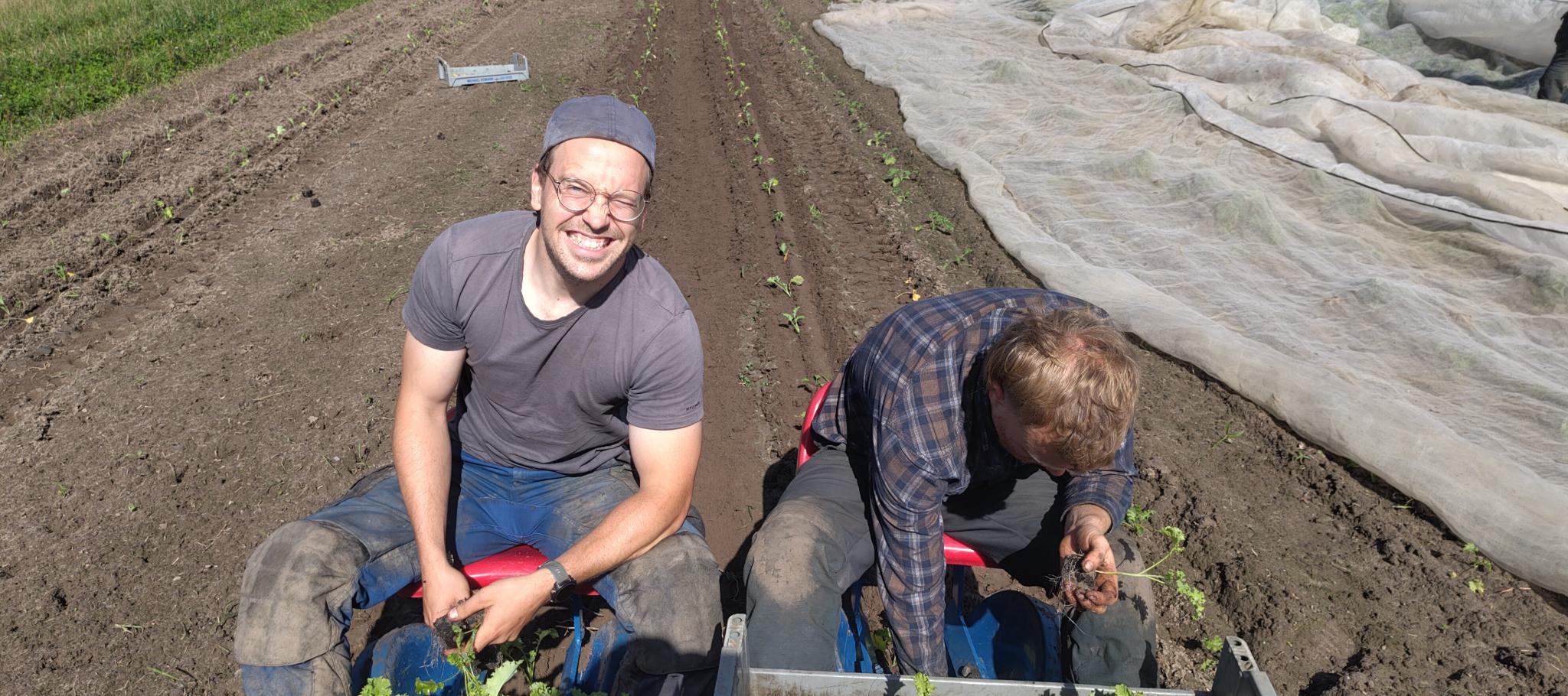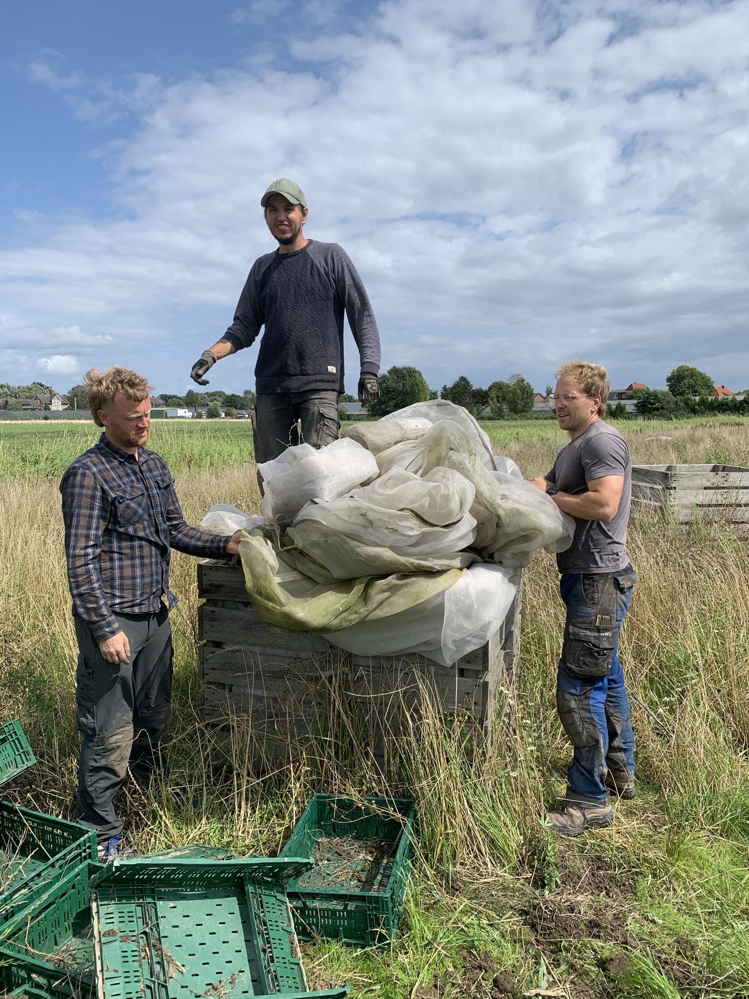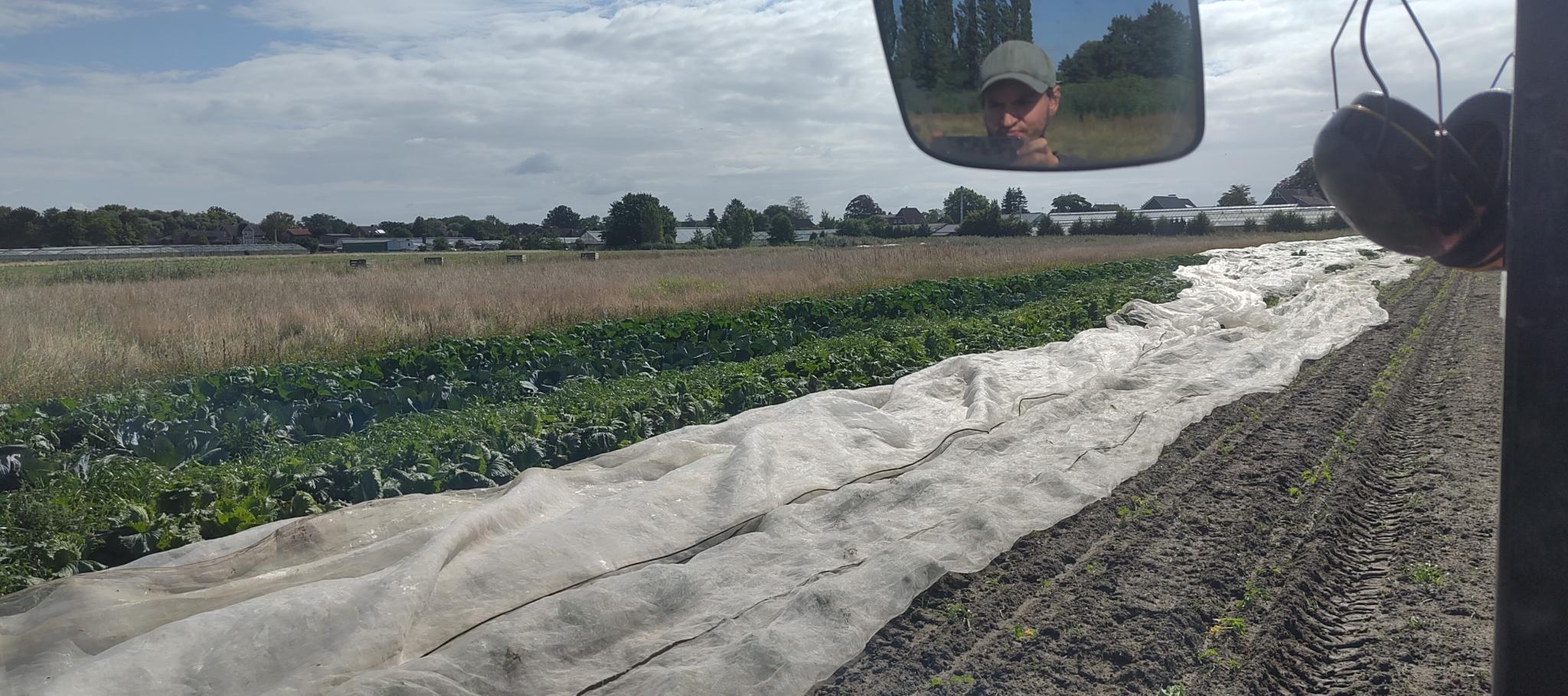 Außerdem ist nun der komplette Grünkohl in der Erde – letzte Woche mussten wir abbrechen, da nach dem Wolkenbruch nicht nur wir komplett durchnässt waren, sondern der Boden klebte, die Andrückräder der Pflanzmaschine die Pflanzen wieder raus rissen und der Trecker anfing im Acker zu versinken. Nicht gut für den Boden. Die Grünkohlpflänzchen sahen diese Woche dann schon etwas verhungert aus, weswegen wir ihnen eine Portion pflanzlichen Flüssigdünger gegönnt haben, den sie interessanterweise auch über die Blätter aufnehmen können. Auf dem Butterberg-Acker, der gute 750 m Luftlinie von unseren anderen Flächen entfernt auf der anderen Seite des Dorfes liegt haben wir dieses Jahr unseren gesamten Kohl. Die alten Hasen unter euch erinnern sich an das Kohlhernie-Drama, das uns im letzten Jahr die gesamte Kohlernte gekostet hat. Wir sind vor dieser Kohlkrankheit mit dem Lagerkohl auf eine „saubere“ Fläche geflüchtet, die uns Sannmann zur Verfügung gestellt hat.