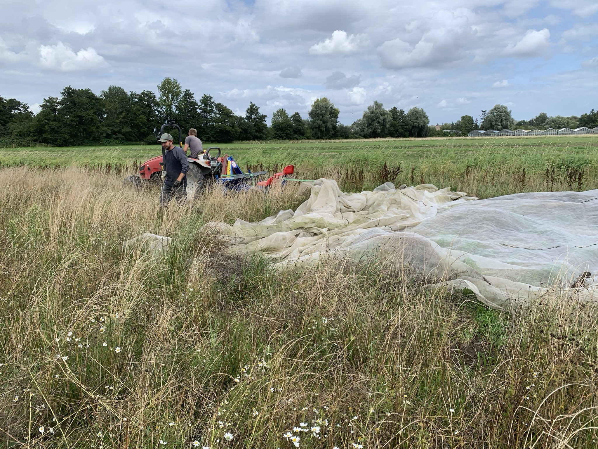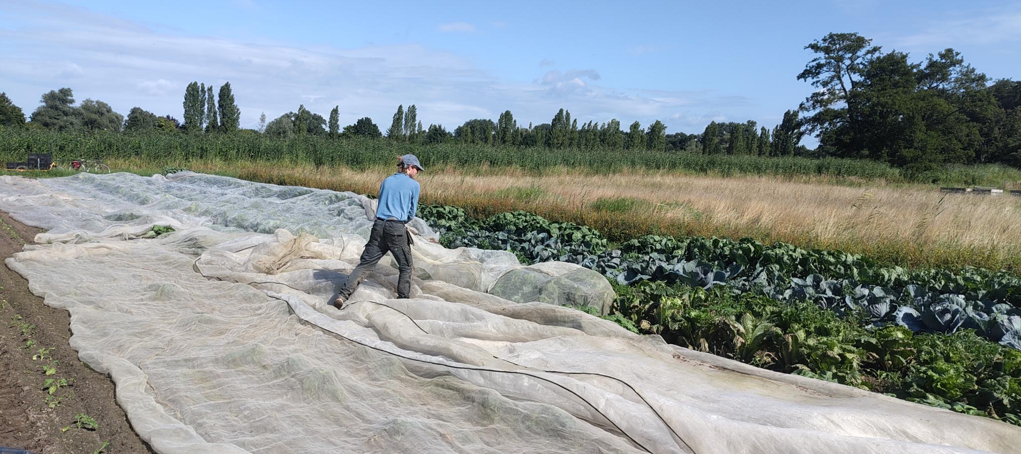 Bis jetzt sieht der Kohl gut aus, ein wenig Schaden durch Kohlweißling-Raupen und natürlich Schnecken ist dabei – gegen ersteres sowie gegen Rehe und Hasen helfen Netze. 4000 m2 mit Netzen einzudecken, zum bearbeiten, pflanzen, säen, hacken, jäten, Schneckenkorn werfen auf und dann wieder zu – ist schon immer jeweils eine Stunde Arbeit zu viert. Da fällt es zum Feierabend hin manchmal etwas schwer, die Contenance zu bewahren :).
