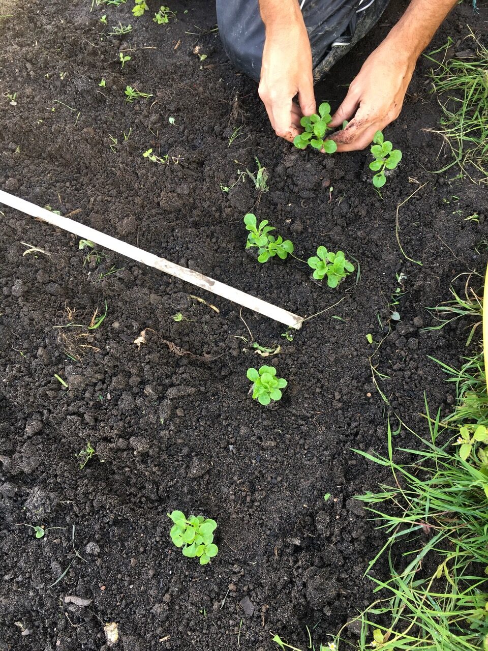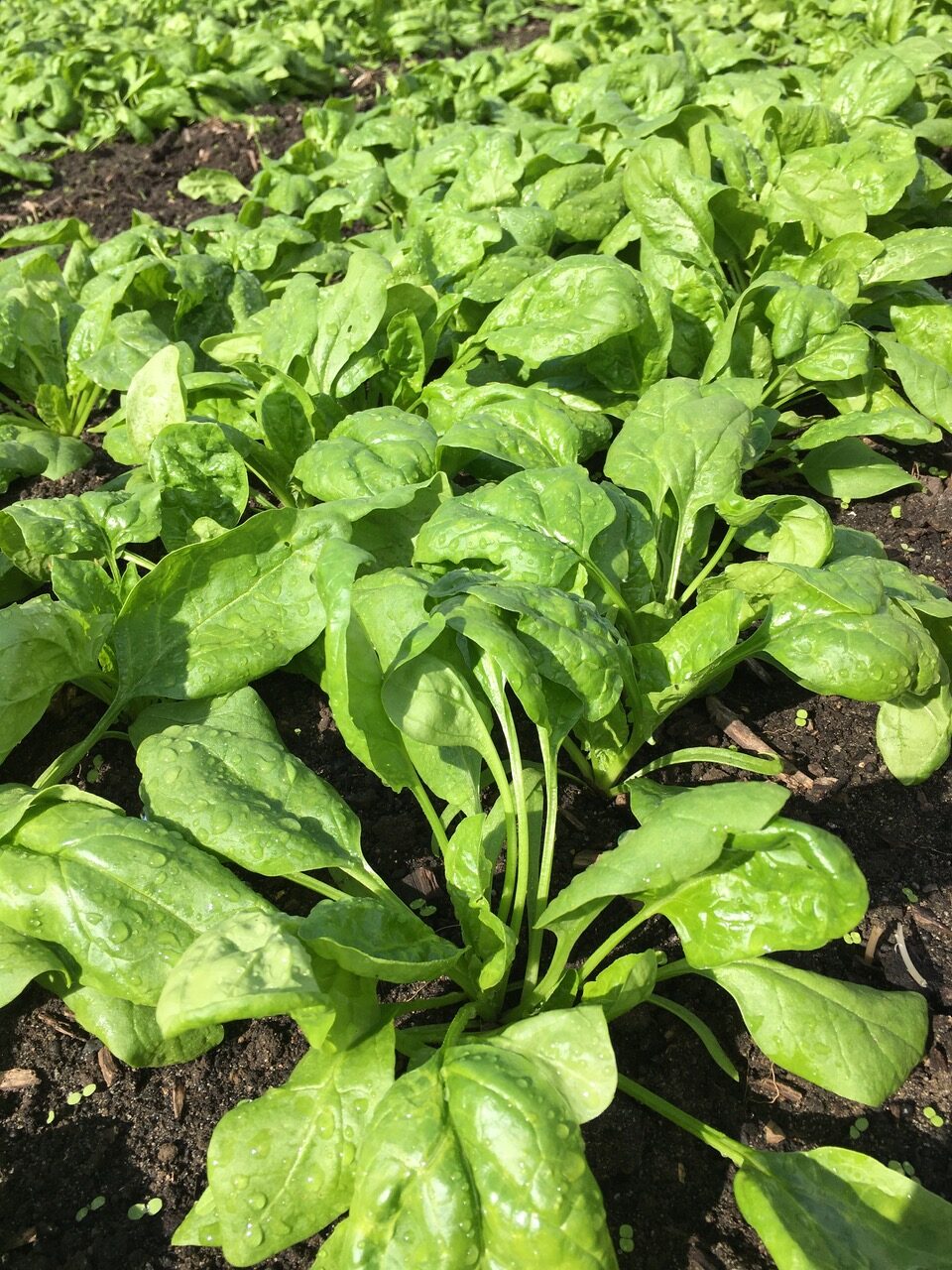 Der neulich erst gepflanzte Asiasalat ist dafür jetzt endlich aus dem Knick gekommen. Wir haben ihn bei großer Hitze pflanzen müssen, und er hat ganz schön die Ohren hängen lassen und wollte auch nicht richtig wachsen. Aber jetzt scheint seine Stunde gekommen! Genauso wie die des Spinats: Mitte August gesät, ist er schon beinahe erntereif.