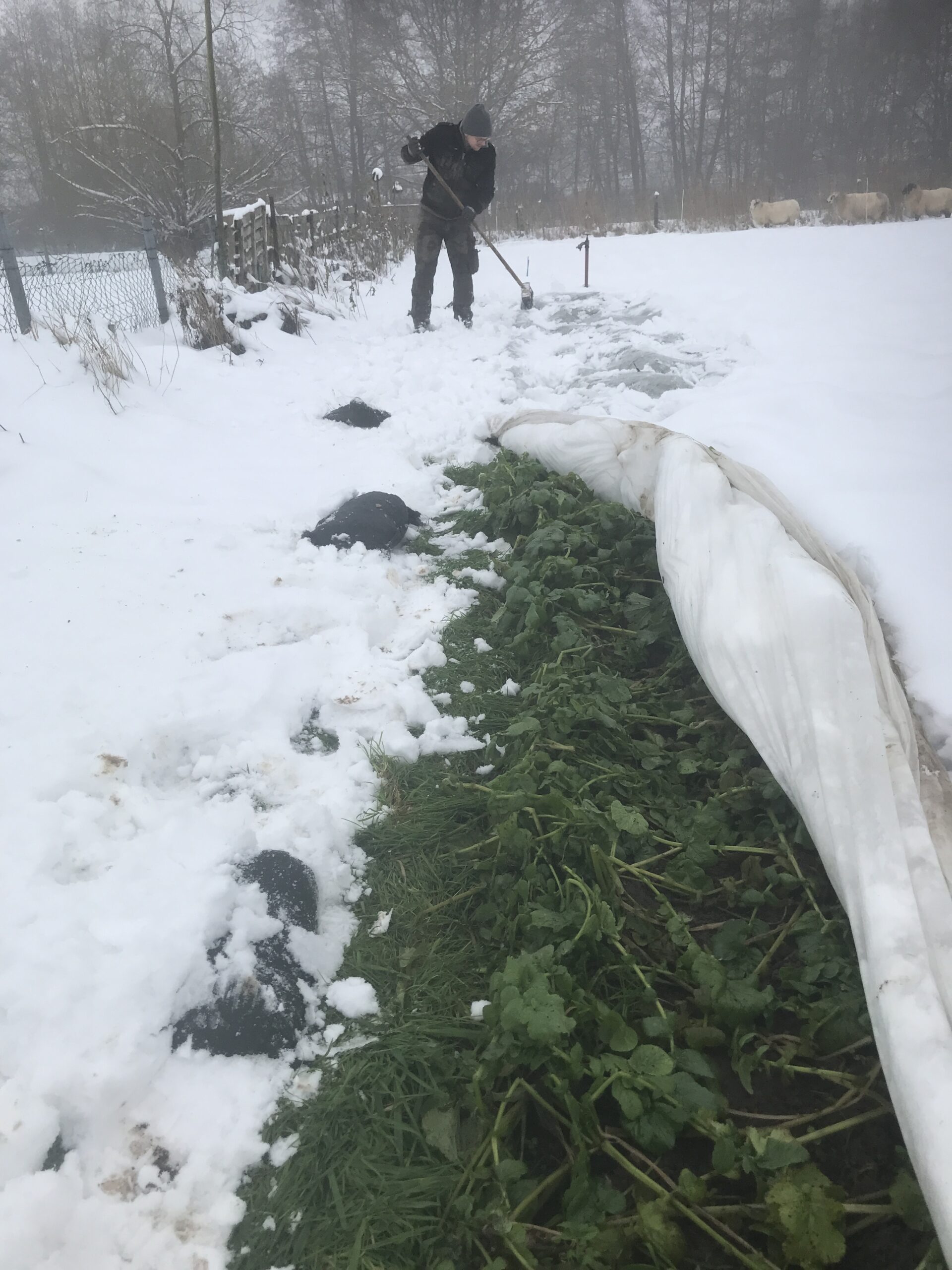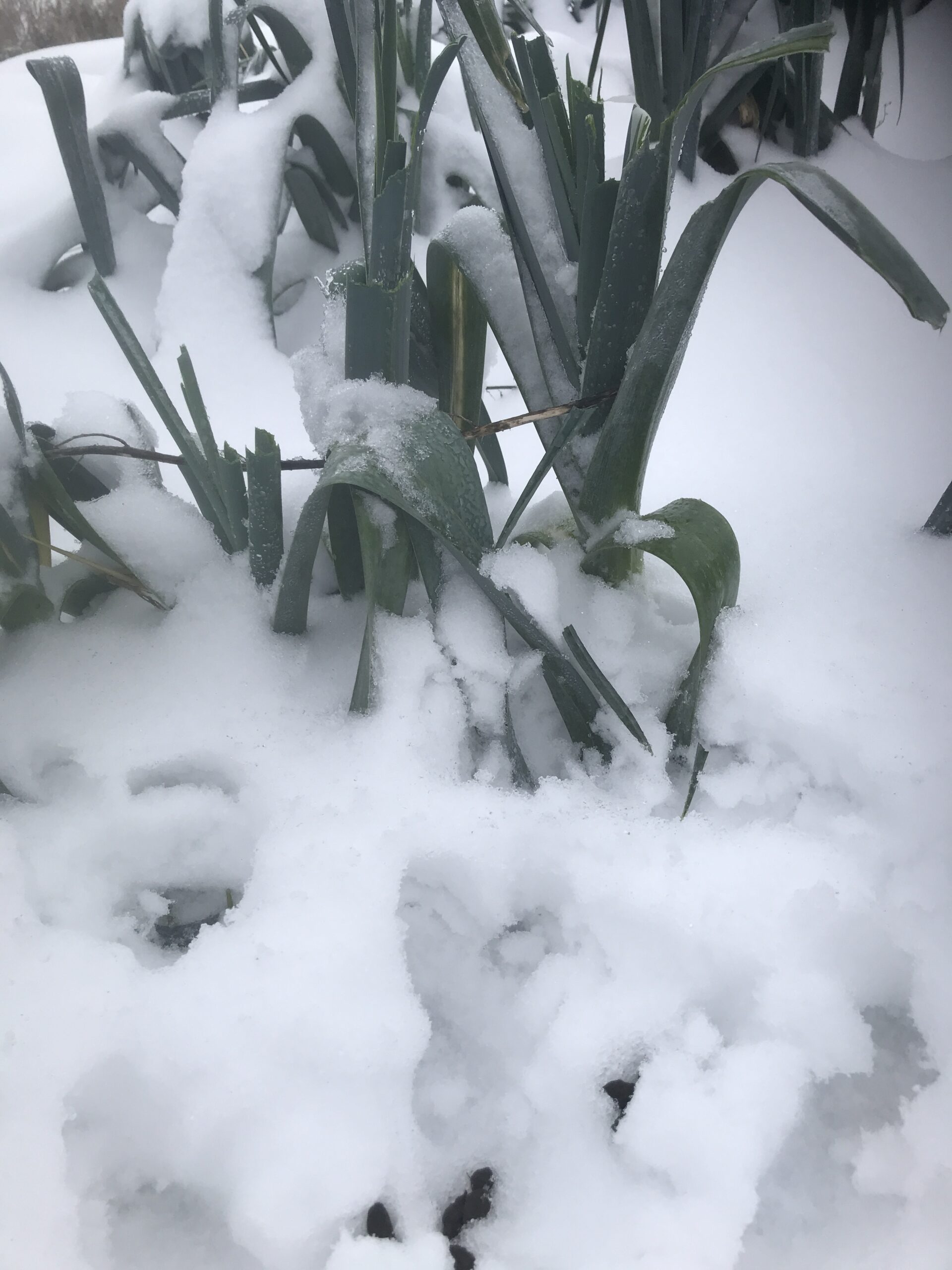 Teilen des Porree geblasen hatte, bevor es drauf geschneit hat. Denn die