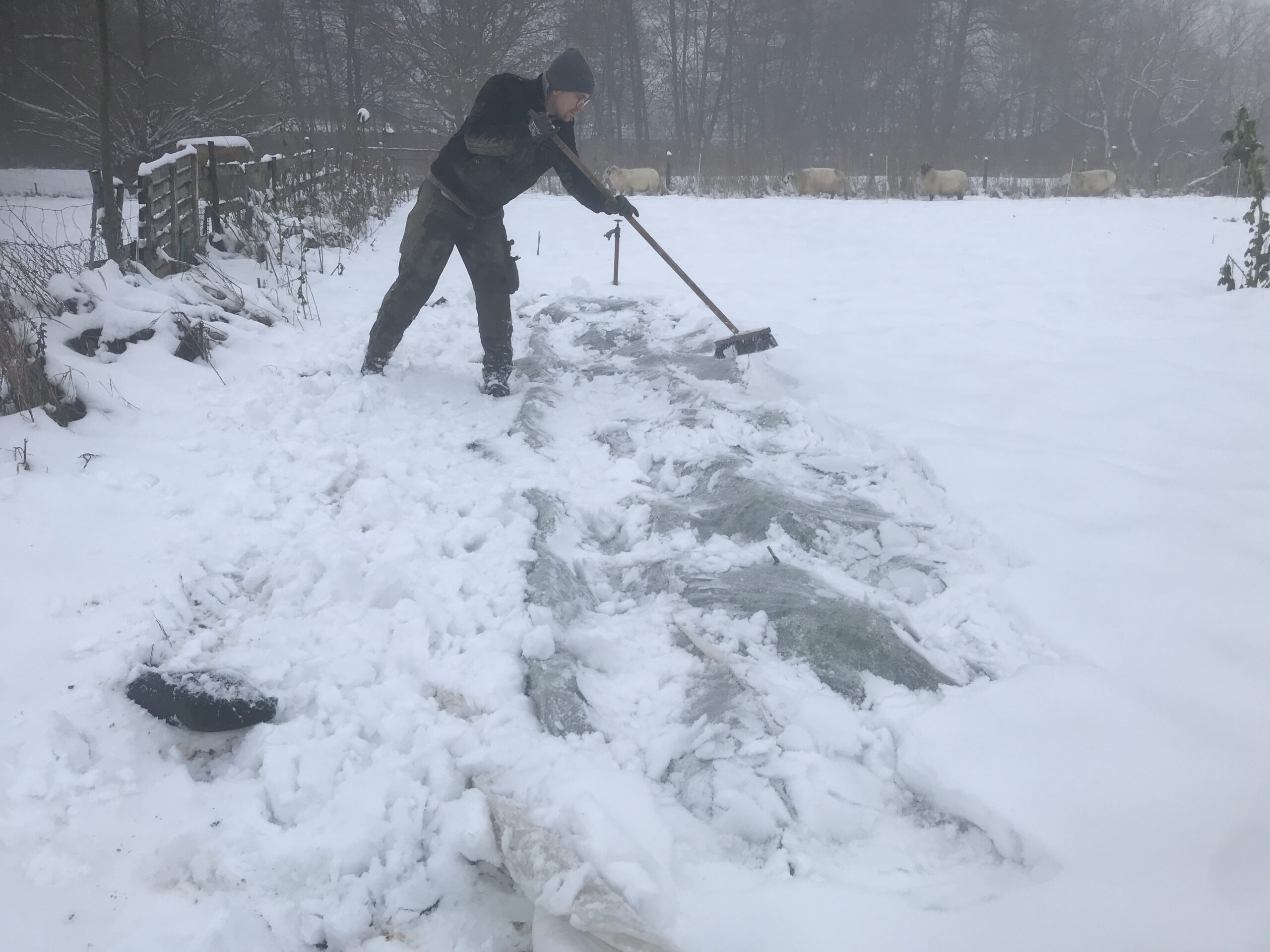 Für uns bedeutet das, vorsichtig vom Rand her den Schnee vom Vlies