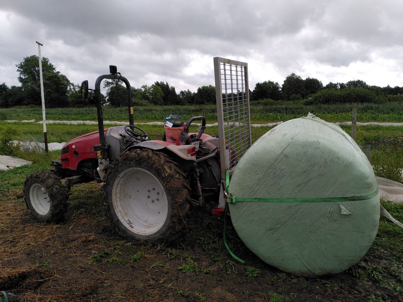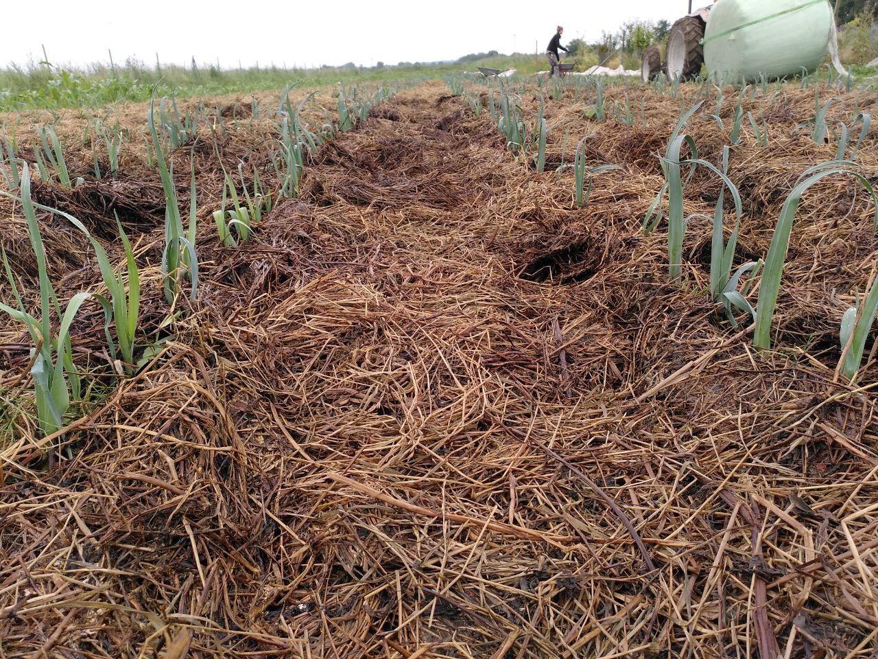 Zwischen dem Porree steht natürlich ziemlich viel Hühnerhirse, die erst gejätet werden muss, und dann wird die Silage zwischen den Pflänzchen verteilt.