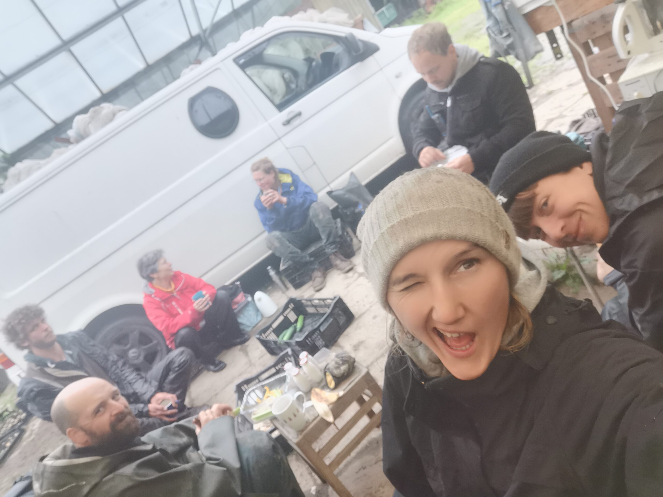 In der Pause haben wir bei Kaffee und Schokokuchen und romantischem Regengeplimper darüber gesprochen, dass es laut dem Netzwerk solidarische Landwirtschaft mittlerweile neben den 464 gelisteten Solawis in Deutschland noch 93 Betriebe in Gründung gibt. Das macht schon Hoffnung, darauf, dass sich etwas in die richtige Richtung ändert. Da kann es noch so viel regnen und stürmen, zusammen schafft man das schon :))